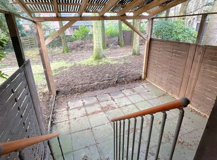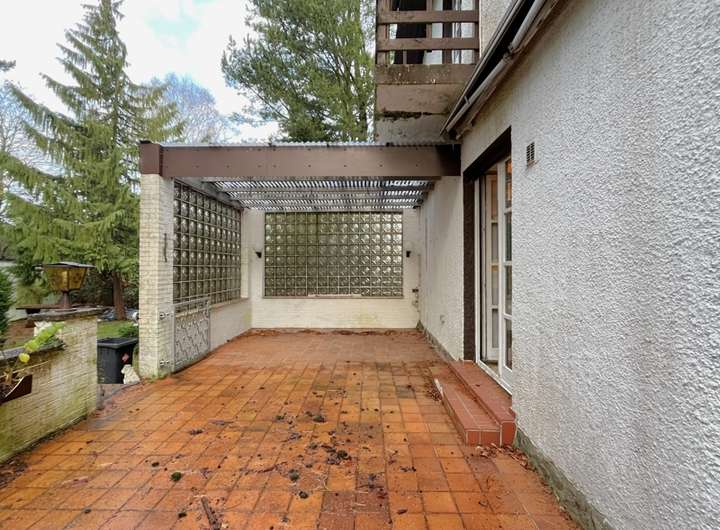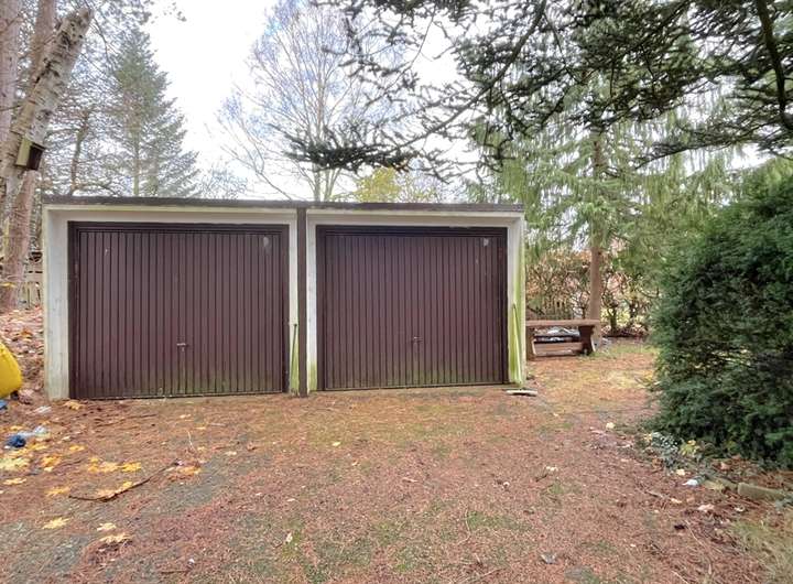 Auf dem Grundstück stehen neben der im Sockel des Anbaus integrierten Garage zusätzlich eine doppelte Fertigteilgarage sowie weitere Außenstellplätze zur Verfügung. Die Terrasse und der Balkon – derzeit ebenfalls sanierungsbedürftig – ermöglichen einen schönen Blick in den grünen Garten.