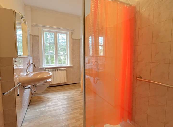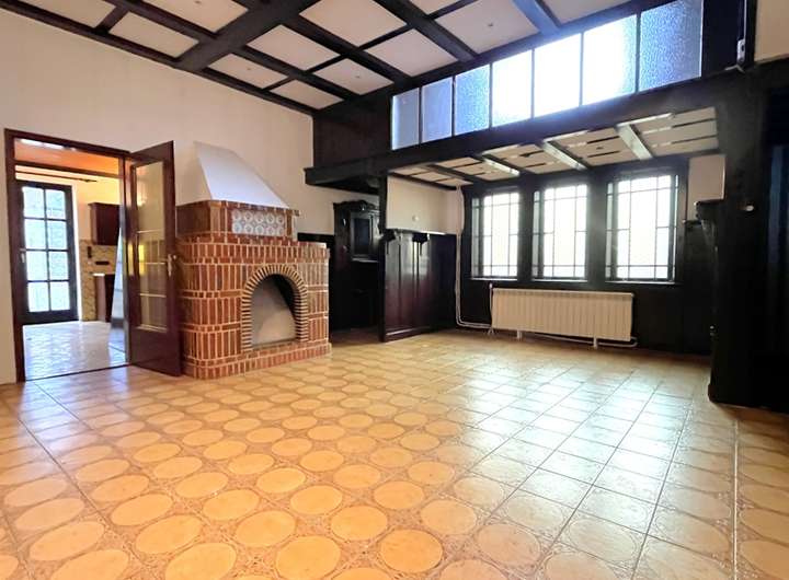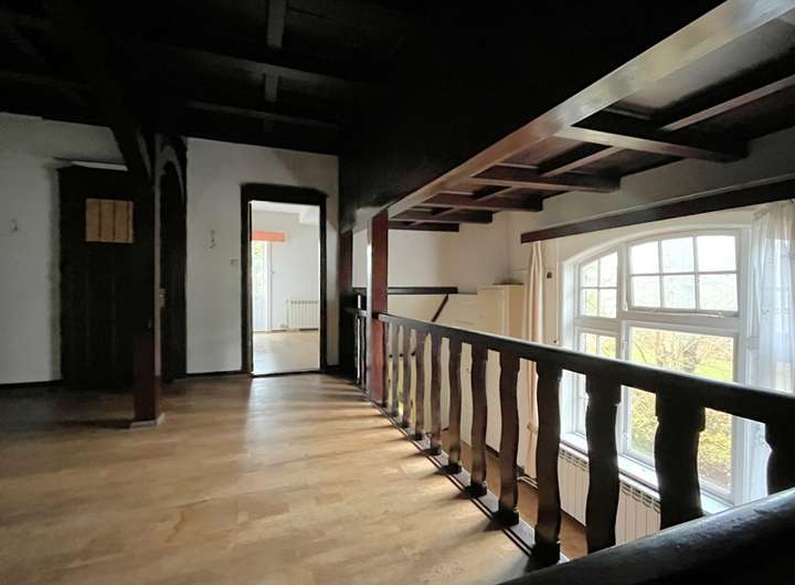 Das Haupthaus wurde etwa 1921 in massiver Bauweise errichtet und beeindruckt noch heute durch seine repräsentative Erscheinung, hohe Räume, sichtbare Holzbalken, Erkerfenster und weitere Originaldetails. Im Erdgeschoss öffnen sich hinter dem Windfang eine großzügige Eingangshalle mit Kamin und mehrere Zimmer, die sich ideal als Wohn-, Ess- oder Arbeitsbereiche eignen. Mehrere Küchen- und Sanitärbereiche dokumentieren eine vielseitige frühere Nutzung und schaffen Spielraum für neue Grundrisskonzepte.