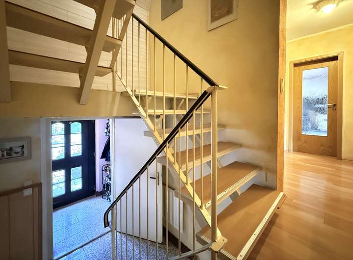 Der Windfang führt in das Treppenhaus, welches alle Etagen miteinander verbindet und einen klar strukturierten Grundriss schafft. Das großzügige Wohnzimmer ist ein Raum, der durch seinen offenen Charakter und die natürliche Lichtführung überzeugt. Die separate Küche ist mit einer elektrischen Fußbodenheizung ausgestattet. Die funktionsfähige Einbauküche mit neuwertigen Geräten kann bei Interesse gegen Aufpreis übernommen werden und fügt sich harmonisch in das Gesamtbild ein. Zwei Badezimmer – eines im Erdgeschoss mit Dusche, eines im Dachgeschoss mit Badewanne – erhöhen den Wohnkomfort zusätzlich. Der vollständig ausgebaute Keller schafft wertvolle Zusatzfläche: Neben reichlich Stauraum steht hier ein beheiztes Arbeitszimmer zur Verfügung – ideal für Homeoffice, Hobby oder Gäste. Eine eigene Tiefgarage sorgt für komfortables Parken, die Gas-Brennwerttherme von 2020 sowie die Energieeffizienzklasse C sichern eine zeitgemäße, wirtschaftliche Haustechnik. Für digitales Arbeiten steht eine Internetgeschwindigkeit von bis zu 250 Mbit/s (Quelle: Check24) zur Verfügung – ein weiterer Baustein für modernes Wohnen.
