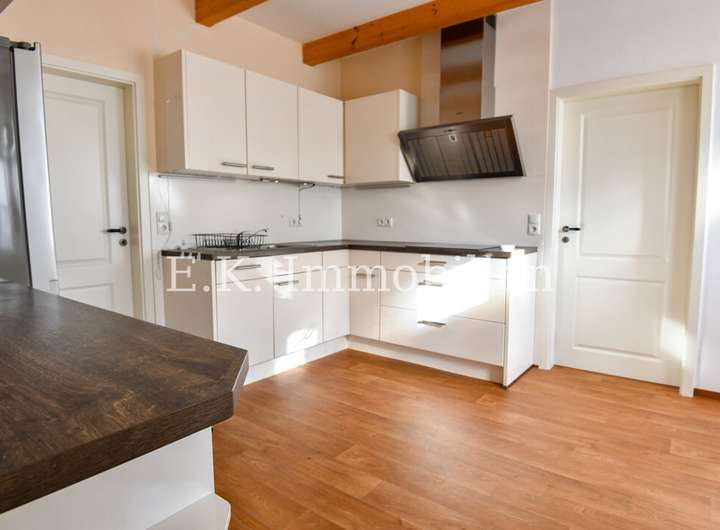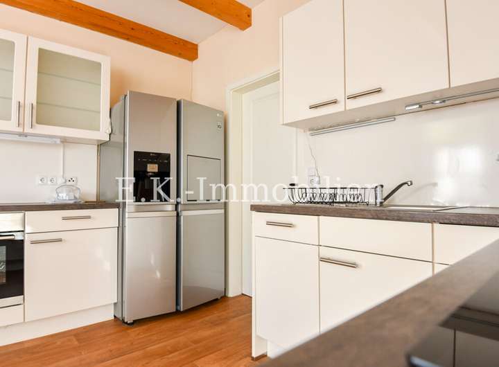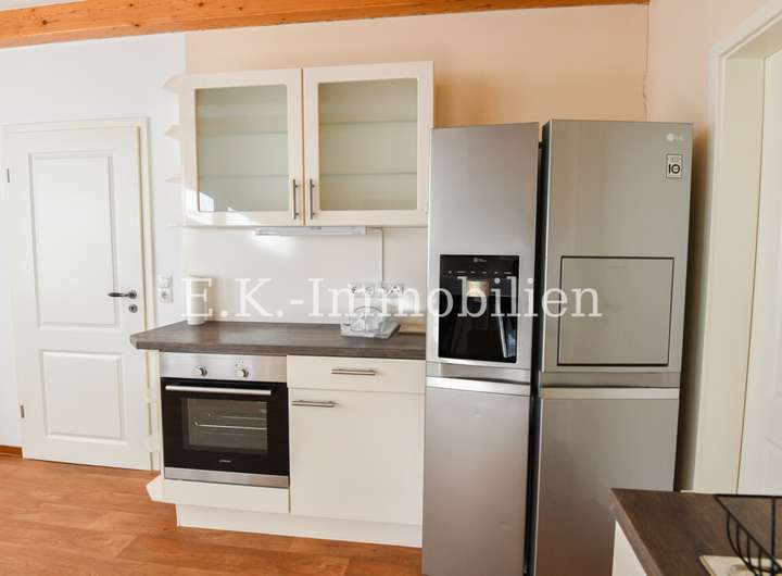 Die Küche, die sich als separater Raum präsentiert, ist mit einer hochwertigen Einbauküche ausgestattet. Diese umfasst praktische Geräte wie einen Backofen und einen Kühlschrank, die Sie gegen eine Ablösesumme vom Vormieter übernehmen können.