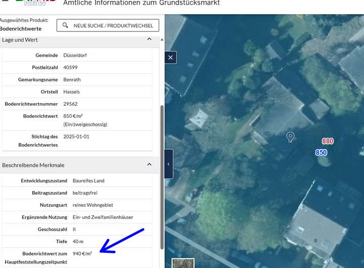Der Bodenrichtwert beträgt ca. 940 €/m², also rund 844.000 € Grundstückswert – der Angebotspreis liegt unterhalb dieses Wertes. In Düsseldorf ist das extrem selten, da ein Grundstücksmangel besteht.