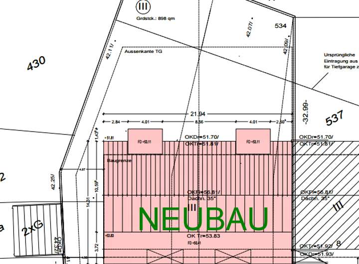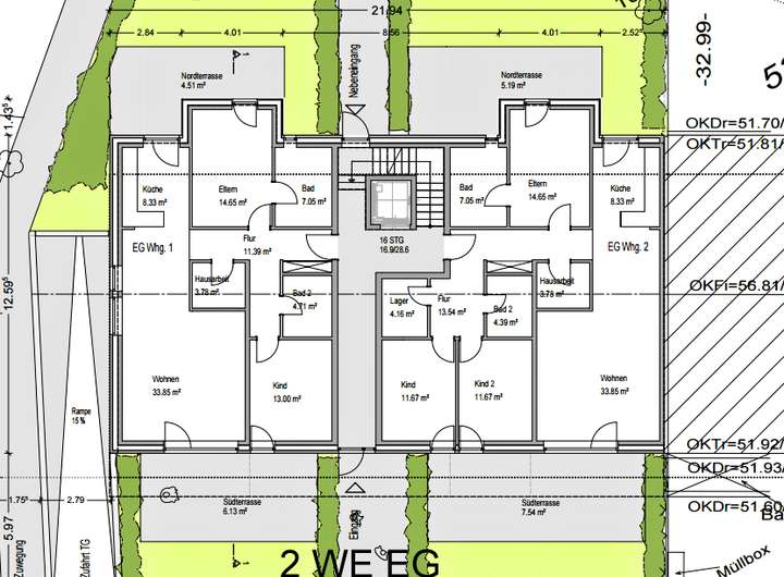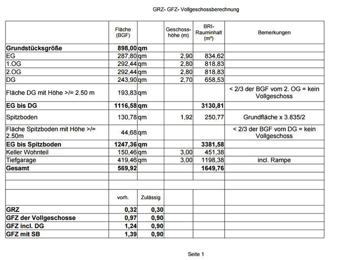 Die komplette Planung ist vorhanden (Grundrisse, Schnitt, BGF, GFZ/GRZ-Berechnung, Ansichten). Die Planung erfüllt die Vorgaben des Bebauungsplans, Befreiungen wurden im Vorbescheid bereits positiv in Aussicht gestellt