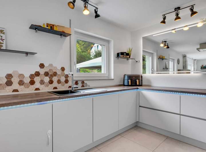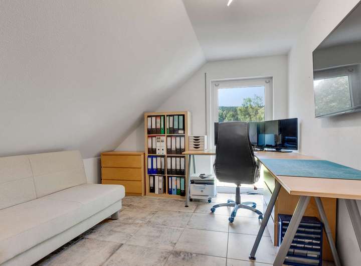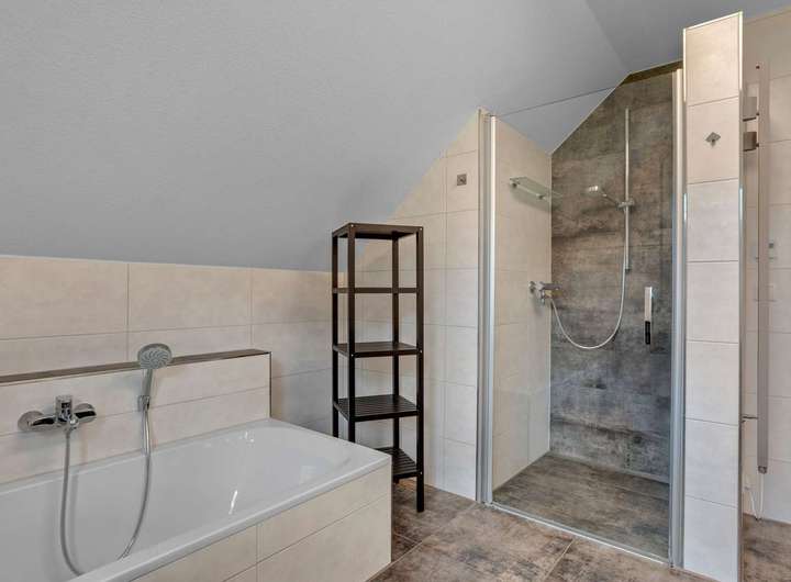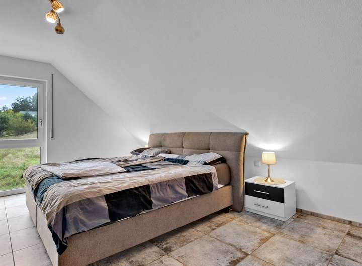 Im Erdgeschoss empfängt Sie eine großzügige Diele mit Gäste-WC und Hauswirtschaftsraum. Der offen gestaltete Wohn- und Essbereich mit 42m² begeistert durch seine Helligkeit – zahlreiche Fenster und eine bodentiefe Fensterfront schaffen ein lichtdurchflutetes Raumgefühl und ermöglichen direkten Zugang zur großen Terrasse. Die hochwertige Nobilia-Einbauküche ist optimal integriert und überzeugt mit viel Tageslicht und durchdachter Ausstattung, inklusive Wasseranschluss hinter dem Kühlschrank und kann für nur 8.000€ übernommen werden. Das gesamte Erdgeschoss ist mit edlen 60x60cm-Fliesen und Fußbodenheizung ausgestattet – modern, pflegeleicht und stilvoll. Im Obergeschoss befinden sich drei Schlafzimmer zwischen 11m² und 14m² mit bodentiefen Fenstern und herrlichem Blick ins Grüne. Das Hauptbad bietet eine bodengleiche Dusche mit Fußbodenheizung, abgesenkte Badewanne, Handtuchheizkörper sowie hochwertige Fliesen mit Edelstahlleisten – auch hier durchzieht der elegante Fliesenboden das komplette Geschoss. Der Kniestock von 75cm sorgt für eine optimale Raumausnutzung.
