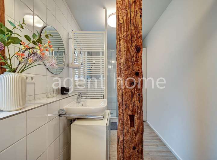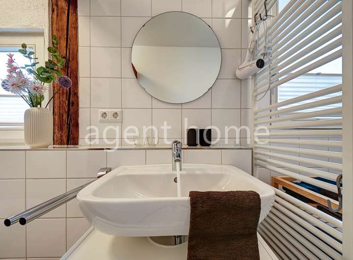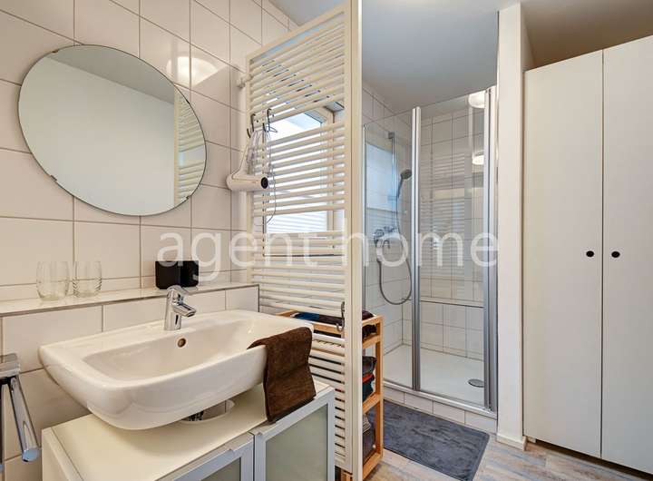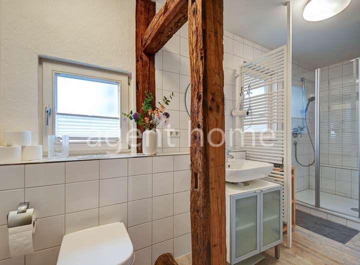 Das neu ausgebaute Badezimmer mit Dusche besitzt Neubaustandard. Das WC ist separat.