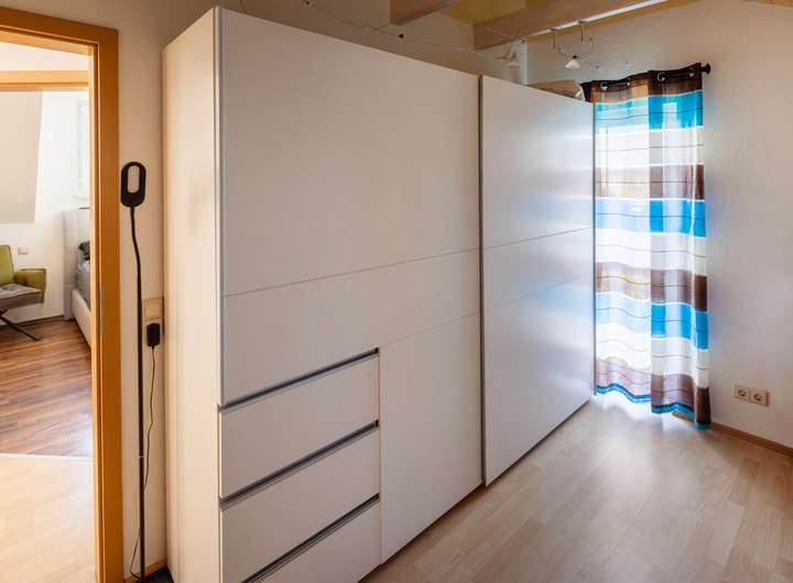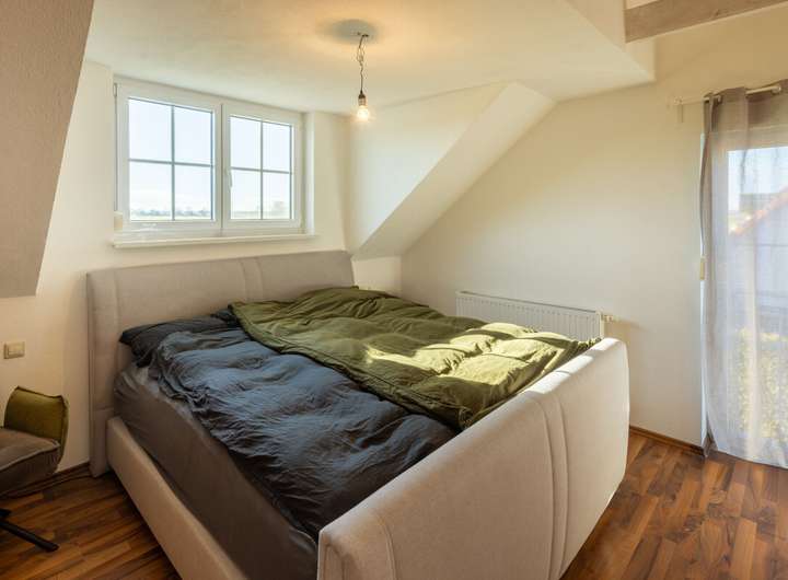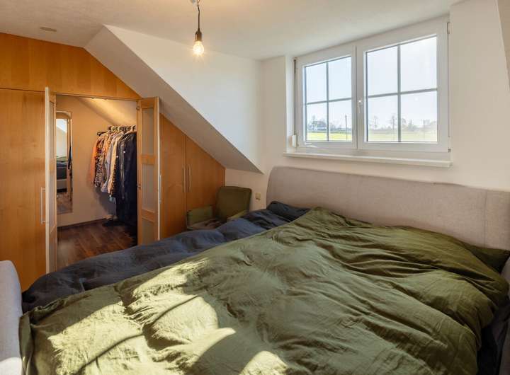 Im Dachgeschoss erwarten Sie drei weitere Zimmer, von denen eines über eine eigene Ankleide verfügt und damit ideal als Eltern- oder luxuriöses Gästezimmer genutzt werden kann. Das modern gestaltete Badezimmer auf dieser Ebene bietet mit der integrierten Sauna zusätzlichen Komfort und einen perfekten Rückzugsort für entspannte Wellnessmomente.