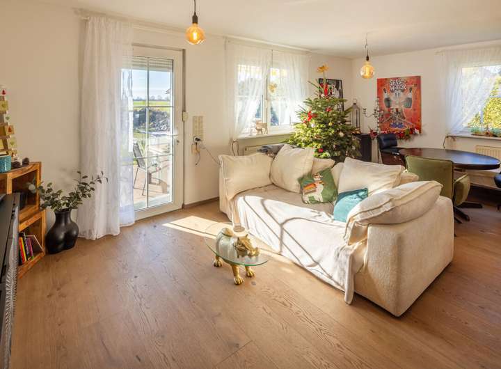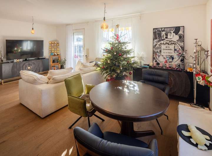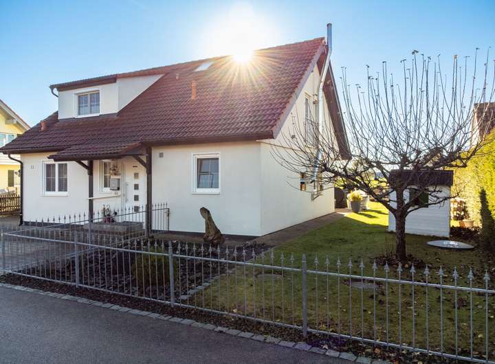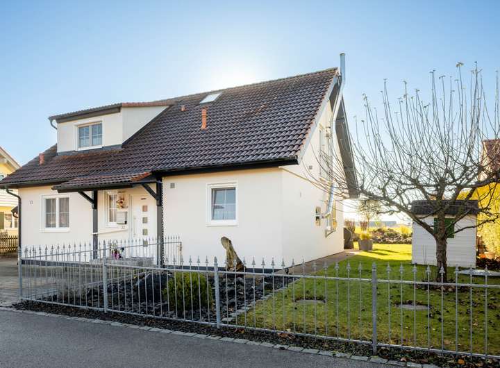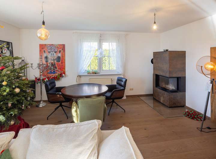 Das einladende Einfamilienhaus in moderner Holzständerbauweise verbindet komfortables Wohnen mit hochwertigen Ausstattungsdetails. Bereits im Erdgeschoss befinden sich ein großzügiges Schlafzimmer, ein Arbeitszimmer sowie ein Badezimmer. Ergänzt wird dieser Bereich durch ein Gäste-WC. Der offene Wohn- und Essbereich besticht durch seine angenehme Atmosphäre, den neuen Kaminofen mit Edelstahl-Außenkamin und den direkten Zugang zur sonnigen Terrasse und dem gepflegten Garten. Die angrenzende, maßgefertigte Einbauküche vom Schreiner überzeugt mit hochwertigen Geräten, einem extra großen Kochfeld und viel Stauraum.