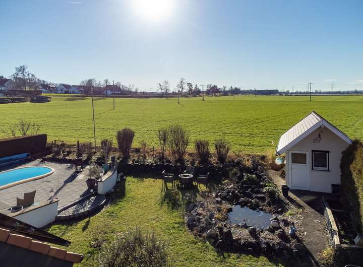 Das Außenbereichsensemble wird durch einen beheizbaren Pool (8 × 4 × 1,5 m) mit effizienter Luftwärmepumpe ergänzt, der von Frühjahr bis Herbst Badespaß verspricht. Eine großzügige Doppelgarage sorgt für komfortables Parken und zusätzliche Abstellfläche.