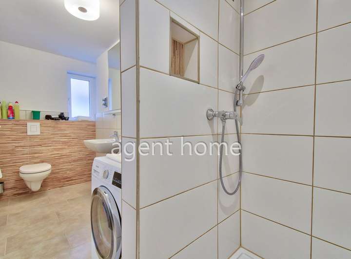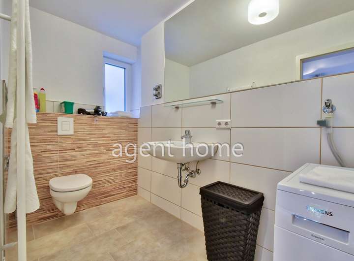 Das geschmackvolle Tageslichtbad ist mit einer bodentiefen Dusche ausgestattet. Handtücher sind vorhanden. Hier befindet sich auch der Waschtrockner.