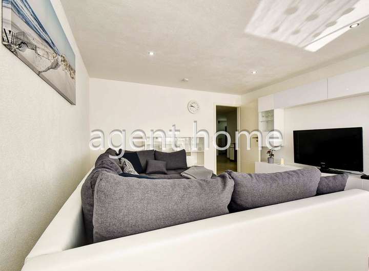 Das Wohnzimmer ist mit einem großen Sofa, einem Smart-TV, einem DVD-Player sowie einem Essbereich für bis zu vier Personen ausgestattet. Von hier gelangt man auch auf die Loggia, die zum Entspannen einlädt.