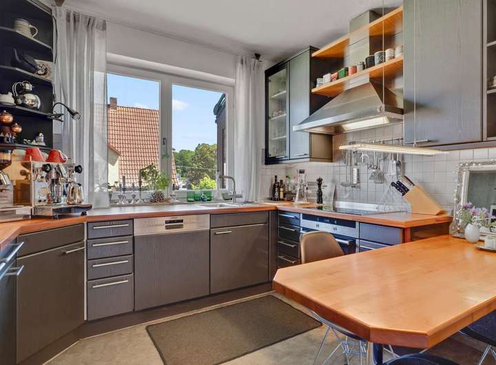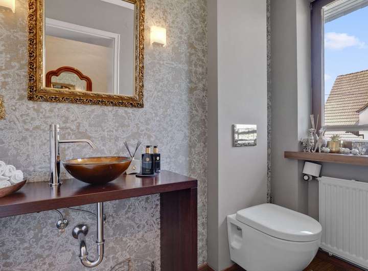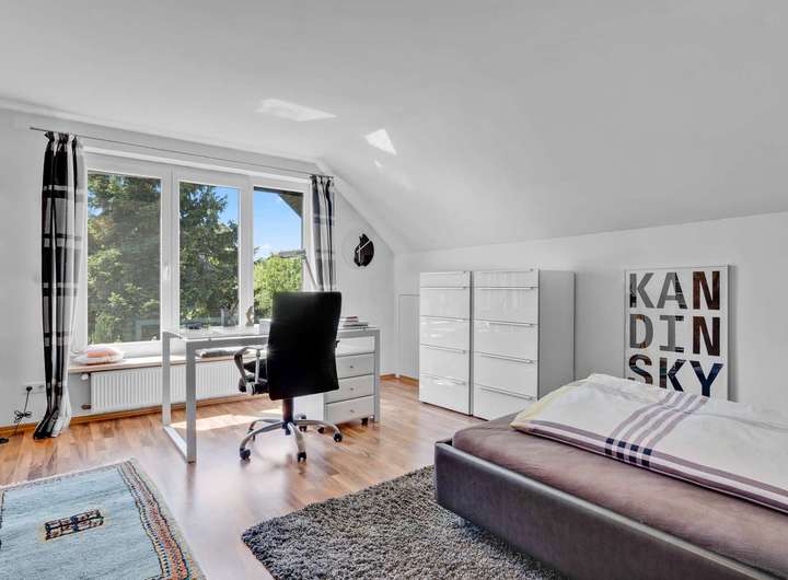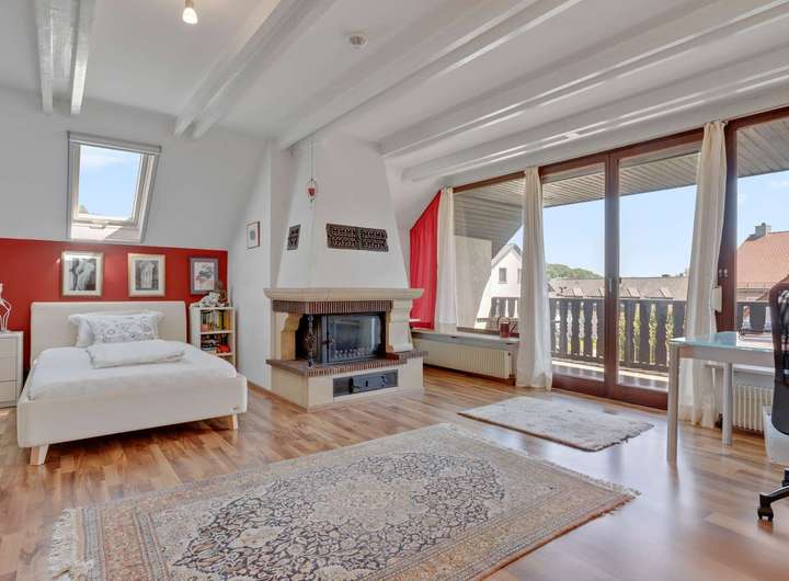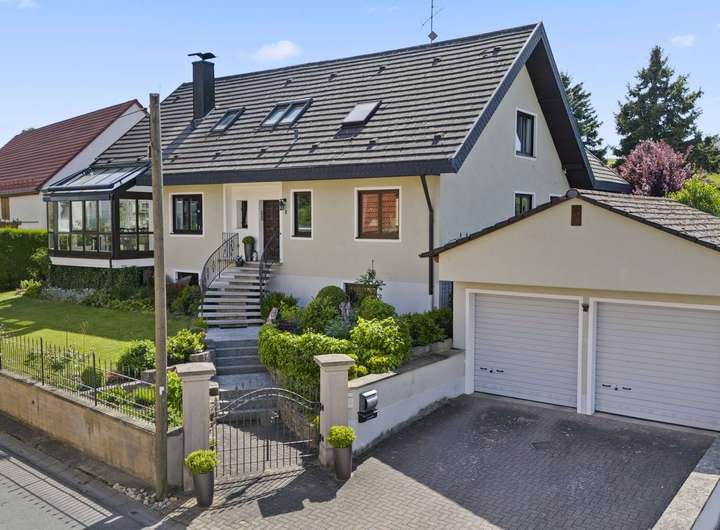 Im Erdgeschoss erwartet Sie eine großzügige Diele mit hochwertiger Marmortreppe, ein offen gestalteter Wohn- und Essbereich mit Kachelofen, Wintergarten und Zugang zur teilüberdachten Südwest-Terrasse. Die Küche ist gepflegt, mit modernen Geräten ausgestattet. Drei Schlafzimmer – darunter ein Elternschlafzimmer mit Zugang zur Terrasse – sowie ein hochwertig ausgestattetes Badezimmer und ein Gäste-WC bieten Komfort auf hohem Niveau. Im Obergeschoss finden sich zwei weitere Schlafzimmer, ein Büro mit Gartenblick sowie ein stilvolles Bad. Besonders hervorzuheben ist das lichtdurchflutete Hauptschlafzimmer mit eigenem Kaminofen, Sichtbalkendecke und Zugang zur Loggia. Der Keller ist vollständig nutzbar, trocken und bietet mit Tageslicht, Waschraum und Außenzugang zusätzliche Möglichkeiten.