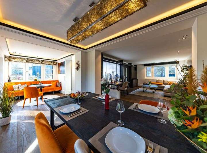 Das Objekt wird komplett möbliert vermietet, inklusive aller Designerstücke – von Eggersmann-Küche bis Flexform-Sofa, von Schramm-Betten bis Jan-Kath-Teppichen –, sodass ein sofortiger Einzug auf höchstem Niveau möglich ist.