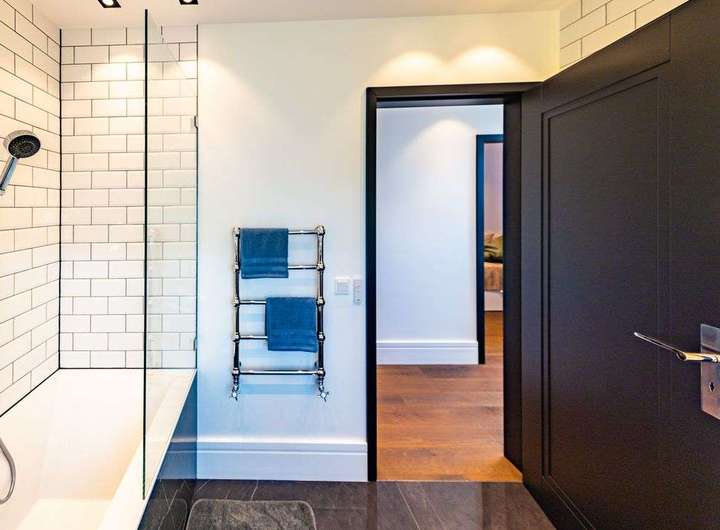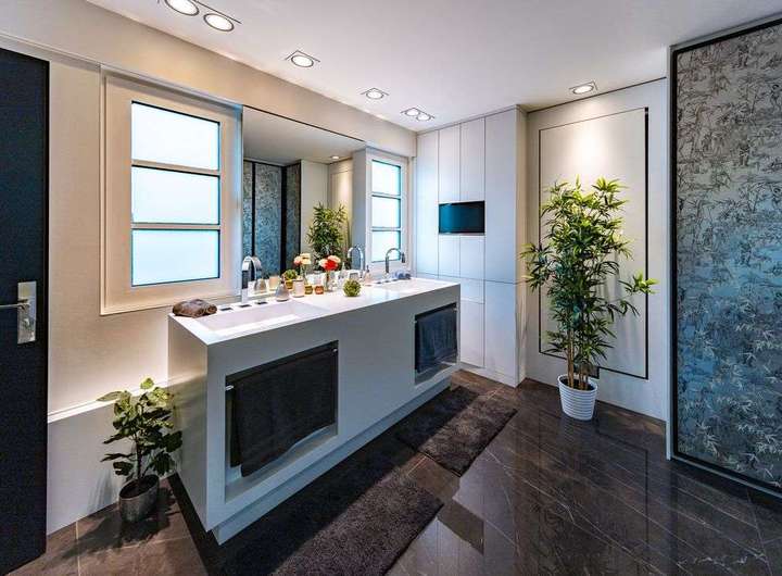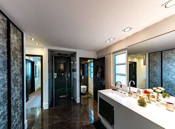 Die Master-Ebene im Obergeschoss bietet ein großzügiges Schlafzimmer mit begehbarem Kleiderschrank sowie ein luxuriöses Bad en Suite, ausgestattet mit Dornbracht-Armaturen, Corian-Waschtisch und Rain Sky Dusche. Ein separates WC ergänzt die Ebene.