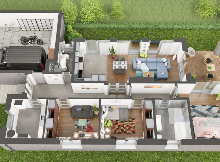 Alle gezeigten Abbildungen und Fotos dienen lediglich als Beispiele. Möbel, Einrichtungsgegenstände, Beleuchtung sowie Außenanlagen wie Terrassen, Zugänge, Stellplätze, Carports, Pools und Gartenanlagen einschließlich Bepflanzung sind nicht Teil des Angebots. Der genaue Leistungsumfang ist in der jeweiligen individuellen Baubeschreibung des Hauses festgelegt.