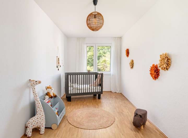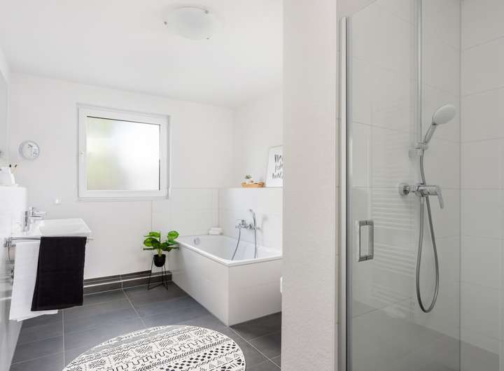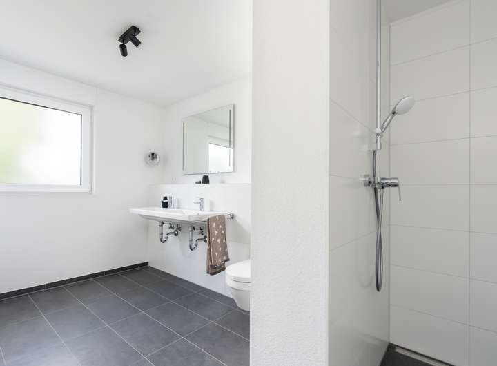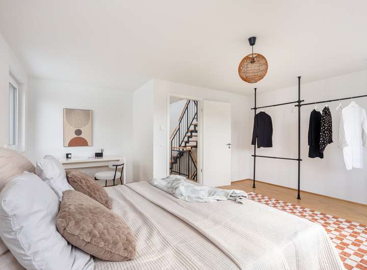 Im Erdgeschoss befinden sich Wohn- und Essbereich mit offener Küche. Bitte beachten Sie: Nur einige Häuser sind mit einer Einbauküche ausgestattet. Diese erhöhen die Kaltmiete jeweils um 70 €. Durch die großzügige Aufteilung entsteht ein fließender Übergang, der viel Platz für das tägliche Familienleben bietet. In den oberen Geschossen stehen mehrere Schlafzimmer und flexibel nutzbare Räume zur Verfügung, die sich gut als Kinderzimmer, Arbeits- oder Rückzugsbereiche einrichten lassen. Die Badezimmer sind modern ausgestattet – unter anderem mit wandhängenden Sanitärelementen, teilweise Doppelwaschtischen sowie großen Spiegeln. Ein separater Kellerraum sorgt für praktische Abläufe im Alltag.