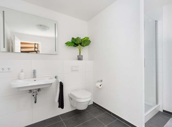 • Moderne Badezimmer mit wandhängenden Sanitärelementen, teilweise Doppelwaschtischen und großen Spiegeln