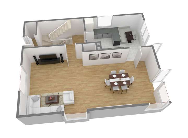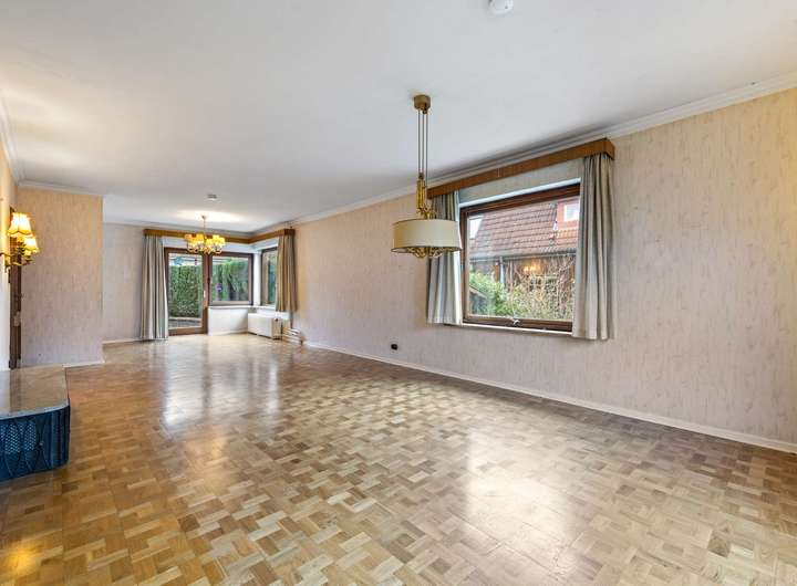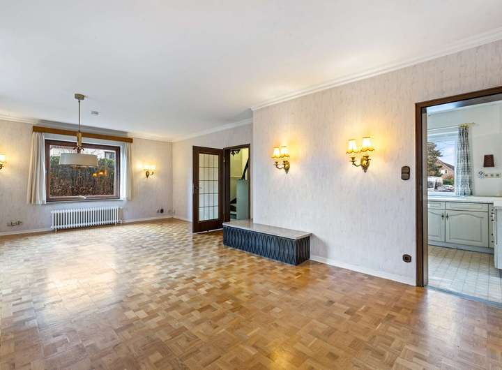Der Lebensmittelpunkt im Erdgeschoss ist der weitläufige Wohn- und Essbereich mit klassischem Stäbchenparkett. Durch seine offene Gestaltung bietet er ausreichend Raum für eine komfortable Sofalandschaft sowie eine größere Esstafel – ideal für familiäre Mahlzeiten oder gesellige Abende. Von hier aus gelangen Sie direkt auf die großzügige Terrasse. Sie bildet eine natürliche Erweiterung des Wohnraums und eignet sich hervorragend zum Entspannen, für Grillabende oder als ruhiger Rückzugsort im Freien. Der angeschlossene Garten präsentiert sich grün und behaglich – ein Ort zum Spielen, Gärtnern oder einfach zum Genießen.
