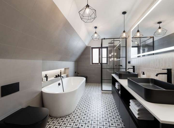 Über eine Treppe mit Holzgeländer gelangen Sie in das Obergeschoss mit charmanten Dachschrägen, Giebel- und Gaubenfenstern. Drei gut geschnittene Zimmer bieten flexible Nutzungsmöglichkeiten – als Schlaf-, Kinder-, Arbeits- oder Gästezimmer. Das Badezimmer auf dieser Ebene verfügt über ein Fenster und ist mit Badewanne, Dusche, Doppelwaschbecken und WC ausgestattet.