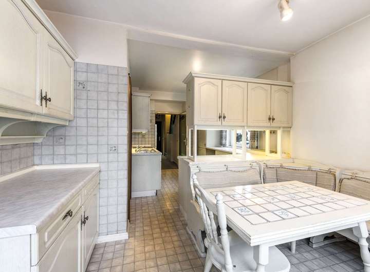Angrenzend an den Wohn-/Essbereich liegt die gut proportionierte Küche, die zusätzlich vom Flur aus betreten werden kann. Ein großes Doppelflügel-Fenster sorgt für viel Tageslicht, und auch von hier eröffnet sich ein Zugang zur Terrasse. Die aktuell verbaute Einbauküche ist älteren Datums, jedoch funktional und bietet genügend Platz für einen Frühstückstisch.