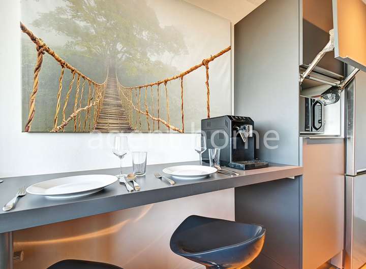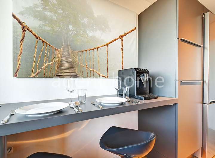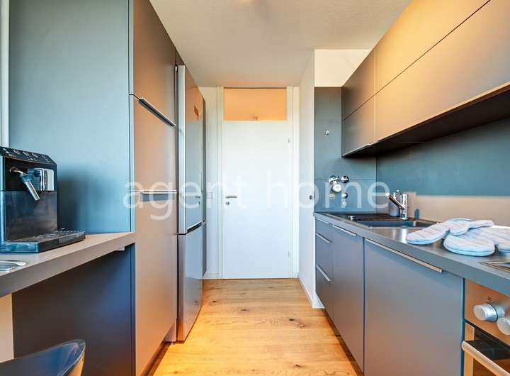 Die moderne Einbauküche ist mit einem Geschirrspüler, einer Kaffeemaschine, einem Wasserkocher, einer Mikrowelle, einem Toaster sowie sämtlichem Kücheninventar ausgestattet.