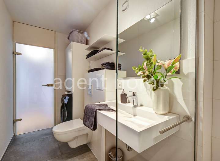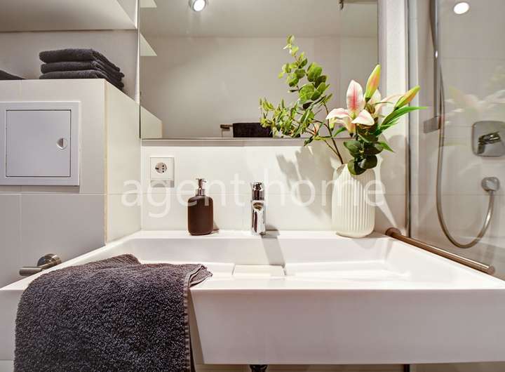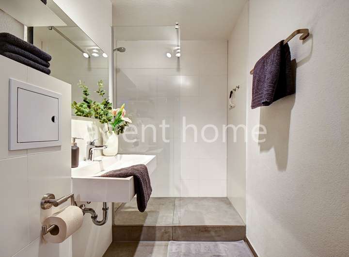 Das hochwertige Badezimmer ist mit einer Dusche ausgestattet. Handtücher und Föhn sind vorhanden. Hier befindet sich auch die Waschmaschine.