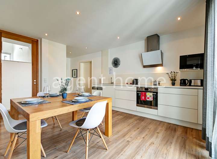 Die hochwertige Wohnküche verfügt über einen Geschirrspüler, eine Mikrowelle, einen Toaster, einen Wasserkocher, eine Kaffeemaschine sowie Kücheninventar. Außerdem gibt es einen Essplatz für vier Personen.