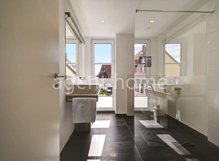 Das erste Schlafzimmer verfügt über ein Doppelbett (1,80x2m), einen Smart-TV, einen Kleiderschrank und einen Arbeitsplatz. Das Tageslichtbad ist en-suite und ist mit einer bodengleichen Dusche ausgestattet.