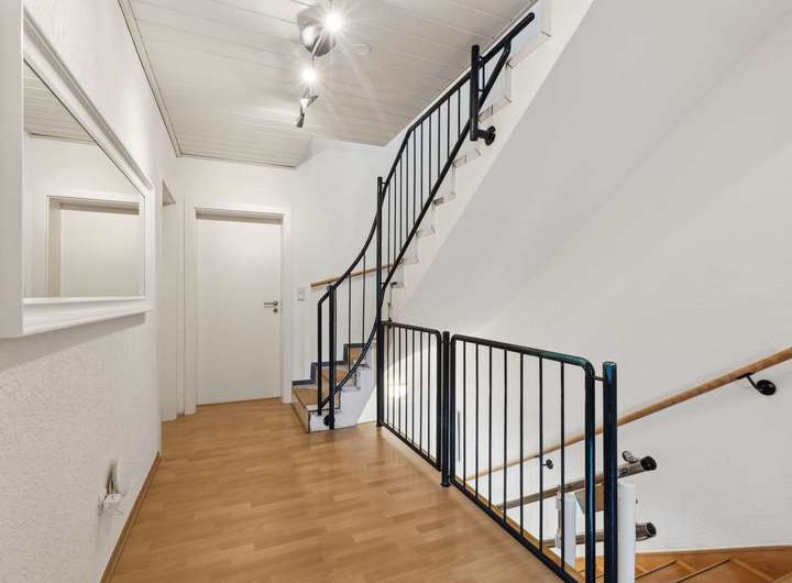 Die vier Schlafzimmer auf den oberen beiden Etagen bieten vielfältige Nutzungsmöglichkeiten – ob als Kinderzimmer, Gästezimmer oder Homeoffice. Ein modernes Badezimmer im 1. Obergeschoss, ein weiteres Bad im 2. Obergeschoss sowie ein zusätzliches Gäste-WC im Erdgeschoss gewährleisten hohen Komfort im Alltag.