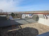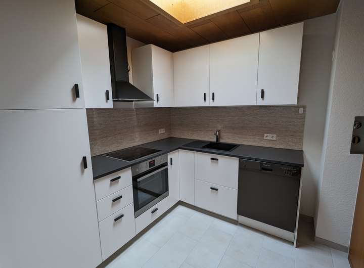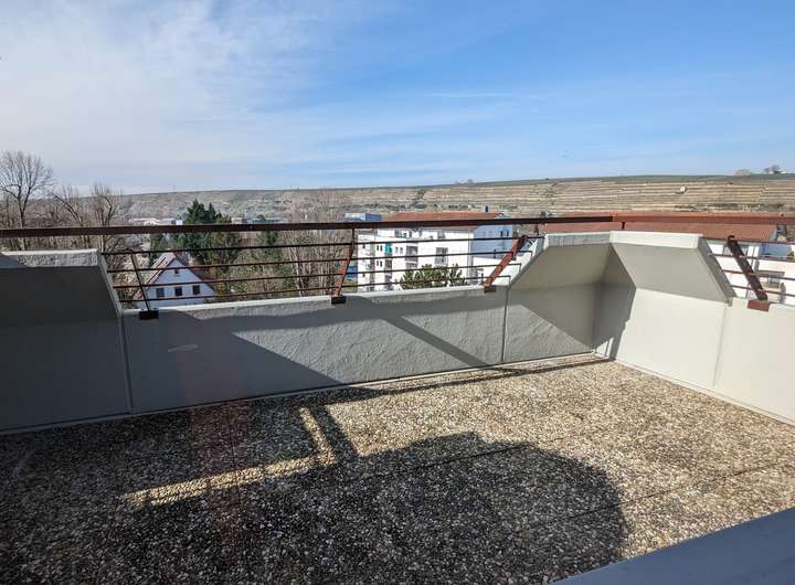 Die Wohnung liegt im obersten Stock eines Mehrfamilienhauses und bietet ein Schlafzimmer sowie einen großzügigen Wohn- und Essbereich mit Zugang zum Balkon. Von dort aus hat man einen schönen Blick auf die Weinberge.