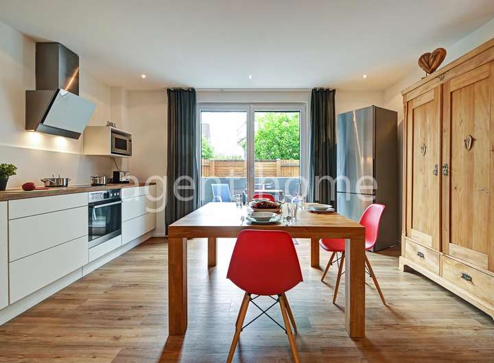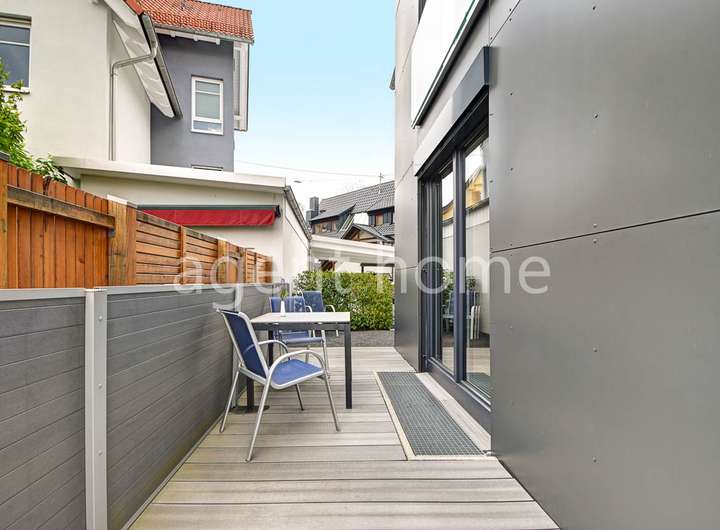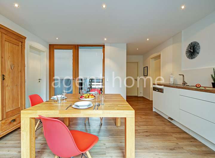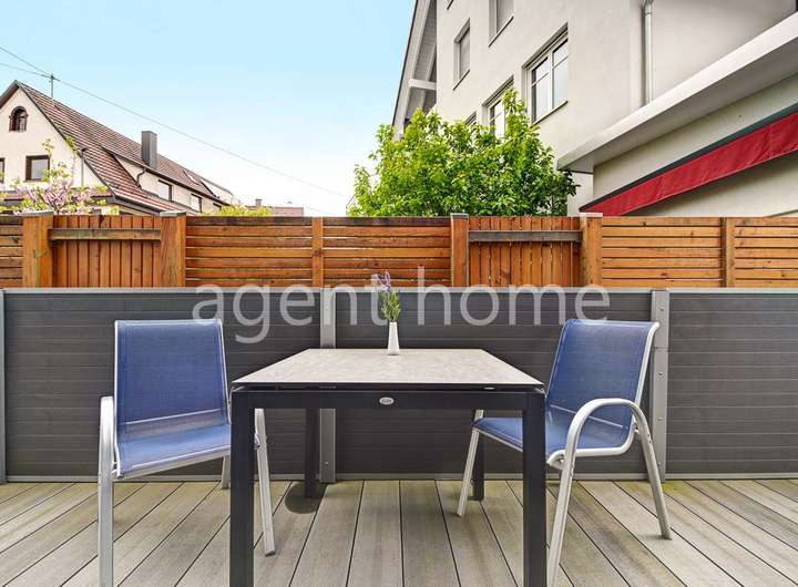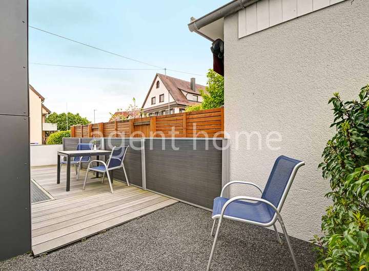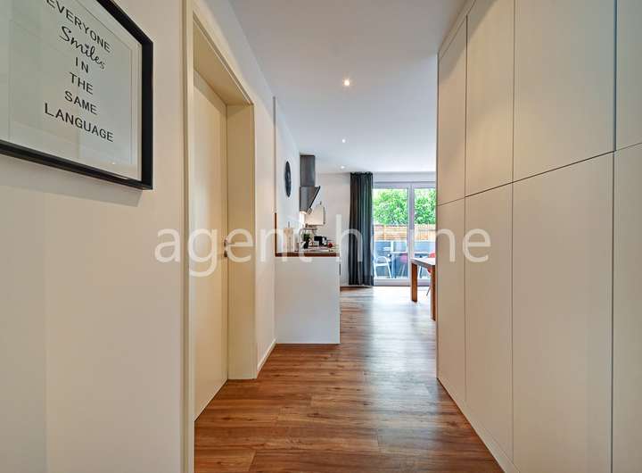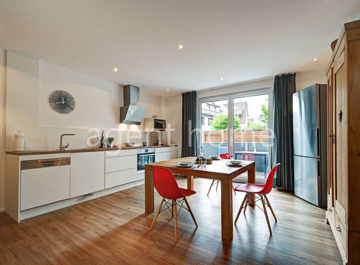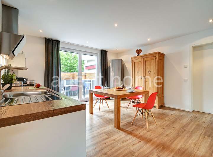 Die Wohnung befindet sich im Erdgeschoss eines gepflegten Mehrfamilienhauses von 2016 und wurde 2023 neu möbliert.