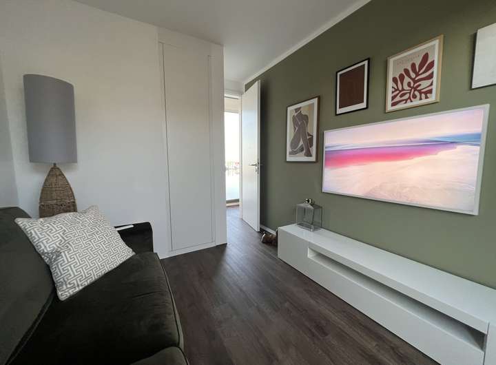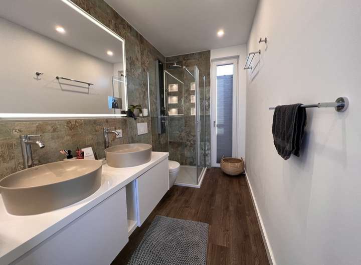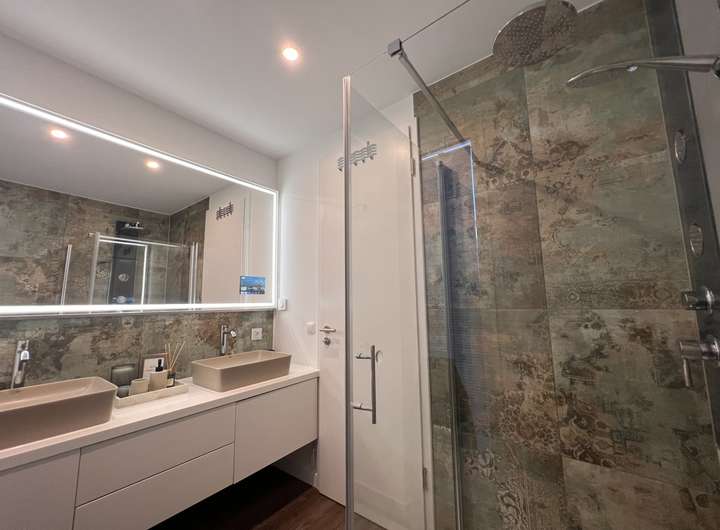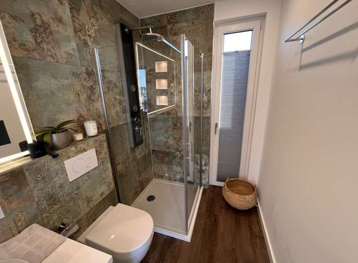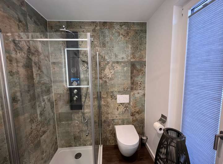 - Bad, vollgefliester Sanititärbereich mit bodentiefer Dusche, Vollglasabtrennung - Waschtisch - Spiegel, Hand- und Kopfbrause, Gäste WC, Einbauspülkasten