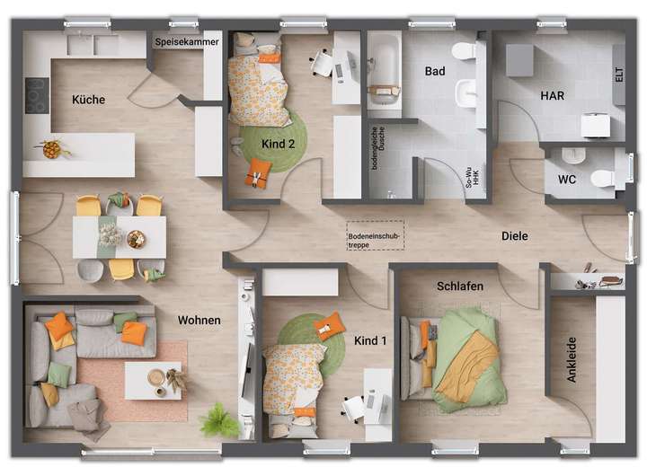 • Fußbodenheizung: Warme Füße? Auch die Fußbodenheizung ist inklusive. Sie steigert nicht nur den Wert Ihres Hauses, sondern sorgt ganz nebenbei noch für echtes Wohngefühl.