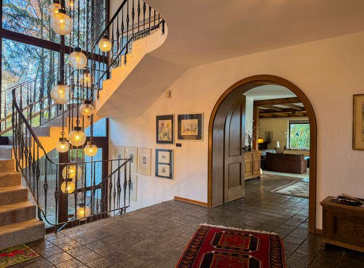 Dieses großzügige Einfamilienhaus erstreckt sich über drei Etagen und bietet mit rund 380 m² Wohnfläche sowie etwa 546 m² Gesamtfläche ein beeindruckendes Raumangebot, das keine Wünsche offenlässt. Schon beim Betreten spürt man die Weite und Flexibilität dieses Hauses – zahlreiche, durchdacht geschnittene Räume schaffen Platz für Familie, Gäste, Hobbys und individuelle Wohnideen. Das Erdgeschoss bildet das Herzstück des Hauses: Ein helles, weitläufiges Wohnzimmer öffnet sich zur sonnigen Terrasse und lädt zu entspannten Stunden im Grünen ein. Hier kann man den Alltag hinter sich lassen, mit Freunden zusammensitzen oder einfach den Blick über den Garten schweifen lassen. Die separate Küche bietet viel Raum zum Kochen, Genießen und Beisammensein – ein Ort, an dem gemeinsame Momente entstehen. Mehrere weitere Zimmer auf dieser Ebene lassen sich flexibel als Arbeits-, Gäste- oder Spielzimmer nutzen und passen sich mühelos an wechselnde Lebenssituationen an. Im Obergeschoss erwarten Sie behagliche Schlafzimmer, Bäder und ein Balkon mit Alpenblick, der zum Verweilen einlädt. Ein besonderes Highlight ist der großzügige Wellnessbereich im Untergeschoss: Mit eigenem Schwimmbad, Jacuzzi, Sauna sowie Dusche und WC wird das Zuhause zur persönlichen Entspannungsoase. Ergänzt wird das Anwesen durch eine außergewöhnlich große Doppelgarage mit Platz für mehrere Fahrzeuge und reichlich Stauraum. Dieses Haus vereint Komfort, Funktionalität und Wohlfühlambiente – ein Zuhause, das Raum für jede Lebensphase bietet und individuelle Träume wahr werden lässt.