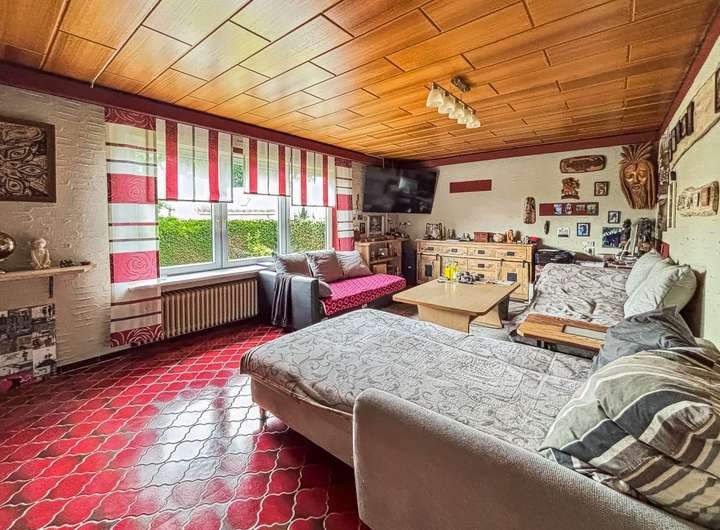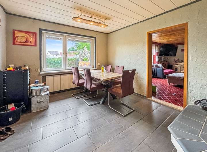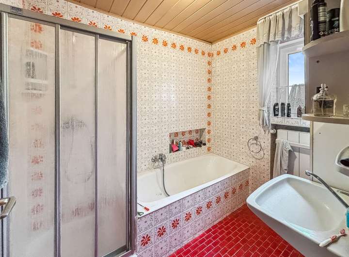 Im Erdgeschoss des Domizils finden Sie ein geräumiges Wohnzimmer, die Küche mit der im Kaufpreis enthaltenen Einbauküche, ein separates Gäste-WC, das Schlafzimmer, ein kleines Büro und das Esszimmer mit Kachelofen. Das Tageslicht-Badezimmer ist noch im Charme der 1970er Jahre gehalten und kann nach Herzenslust neu gestaltet werden.