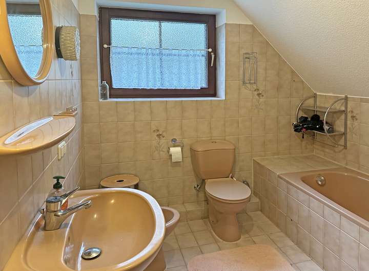 Das Gebäude ist in massiver Rotklinkerbauweise ausgeführt und mit zweifach verglasten Wiener-Sprossen-Fenstern ausgestattet, die dem Objekt einen charmanten, klassischen Charakter verleihen. Im Erdgeschoss sind helle, großformatige Fliesen verlegt, während die Zimmer im Dachgeschoss mit Teppichboden ausgestattet sind. Das Gäste-WC sowie das Vollbad, mit Dusche, Badewanne und Bidet, entsprechen dem Stil der 1980er Jahre; beide Räume verfügen über ein Fenster zur natürlichen Belüftung.