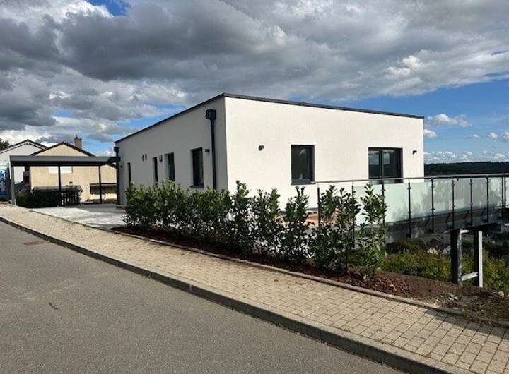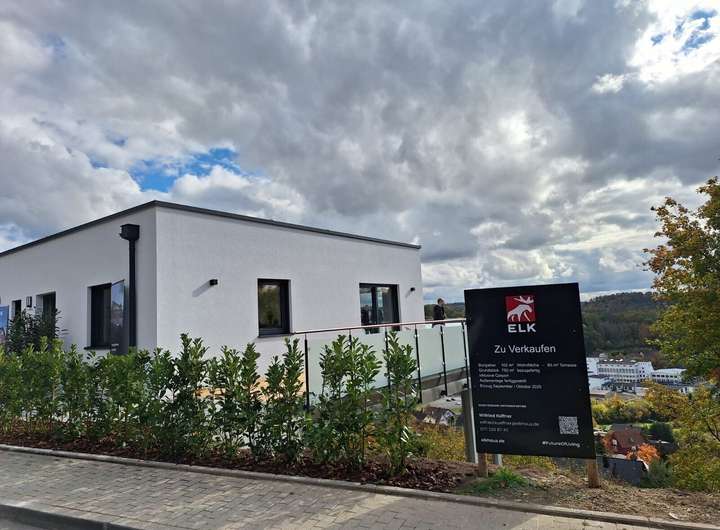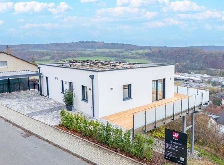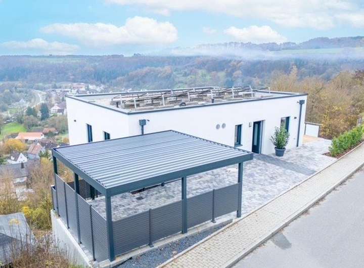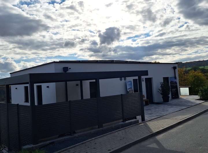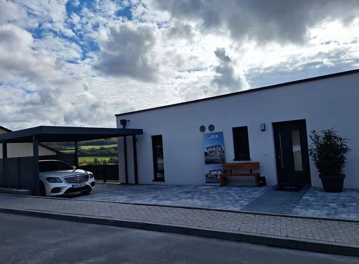 Der Bungalow ELK 102 in Holzständerbauweise überzeugt durch seine gelungene Aufteilung und fügt sich wunderbar in das Gelände ein. Da der Bungalow am Hang gebaut ist, ist er komplett barrierefrei. Das Alleinstellungs Merkmal erhält der Bungalow durch seinen barrierefreien Eingangsbereich- und da er auf der Südseite auf Pfeilern steht- sowie auch die Terrasse bietet er eine Traumaussicht die unverbaubar ist. Von der Terrasse blicken Sie in die Ferne oder auf eine mit Bäumen bewachsene Fläche: Natur Pur. Der Wohn /Essbereich Süd West mit großen Fenstern ,Elternschlafzimmer mit direktem Zugang auf die Terrasse und vom Bett aus eine herrliche Aussicht. Auch eine Ankleide darf nicht fehlen. Das Büro/ Kinder oder Gästezimmer - für was es auch genutzt wird, hat zwei bodentiefe Fenster mit 11,76 m2. Das komplett ausgestattete Bad mit Badewanne, Dusche und WC in einem eleganten Design. Einzelwaschbecken mit Unterschrank und Spiegel. Der Technikraum mit einer Luft/ Luft Wärmepumpe mit Kühlfunktion sorgt für eine kontrollierte Be- und Entlüftung .Durch diese Anlage haben wir eine Wärmerückgewinnung von ca. 80 %. Bei diesem Haus haben Sie enorm wenig Energiekosten. Das Schlafzimmer ist mit einem Sauerstoffbeipass ausgestattet, so können Sie selbst entscheiden wieviel Frischluft Sie beim Schlafen benötigen ohne das Fenster zu öffnen .Die Terrasse ist mit Douglasie belegt das, Terrassengeländer aus Glas mit einem Edelstahlhandlauf. Ein Alu Carport pulverbeschichtet in anthrazit dadurch wartungsfrei, kein nachstreichen! Grösse 6,00 x 4,80 Meter bietet genügend Platz für ein Auto / Fahrräder / Mülleimer. Der Carport ist an 2 Seiten 2/3 geschlossen und auf der Südseite ca. 1 mtr .