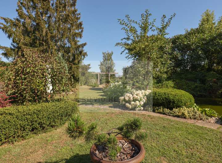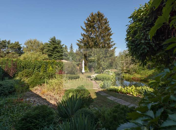 Der Garten überzeugt mit stilvoller Gestaltung, einem Teich samt Bachlauf, gezielter Beleuchtung und durchdachter Bepflanzung.