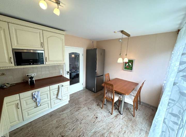 Die Einbauküche ist mit hochwertigen Marken-Elektrogeräten ausgestattet und fügt sich harmonisch in das stilvolle Gesamtbild ein.