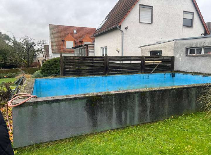 Hinter der Garage befindet sich ein gemauertes Schwimmbecken.