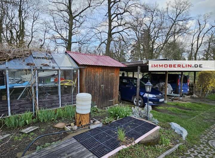 Auf dem naturschönen Grundstück sind in zwei Garagen und einem Carport drei überdachte Pkw-Stellplätze vorhanden. Außerdem gibt es ein Gewächshaus und einen Geräteschuppen.