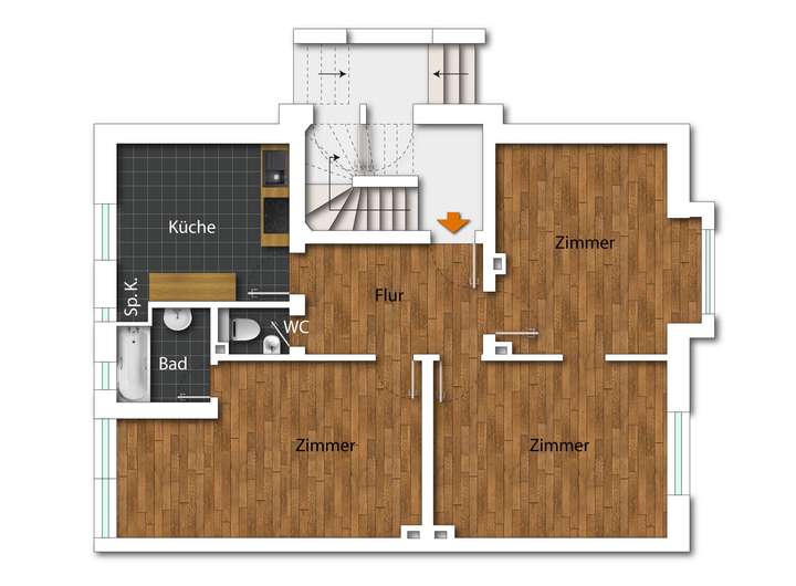 Jede der drei Wohneinheiten verfügt über drei gut geschnittene Zimmer, eine separate Küche, ein Badezimmer sowie ein separates WC.