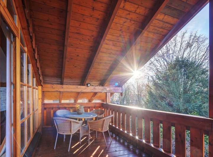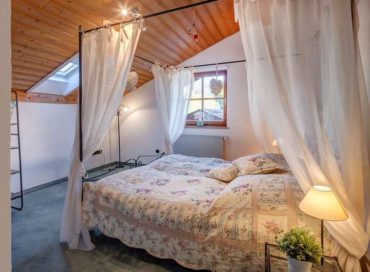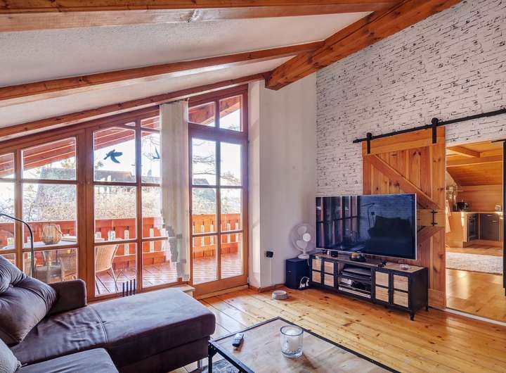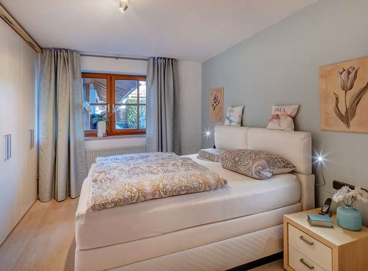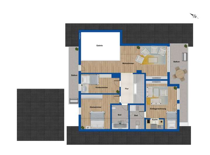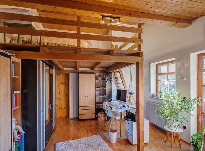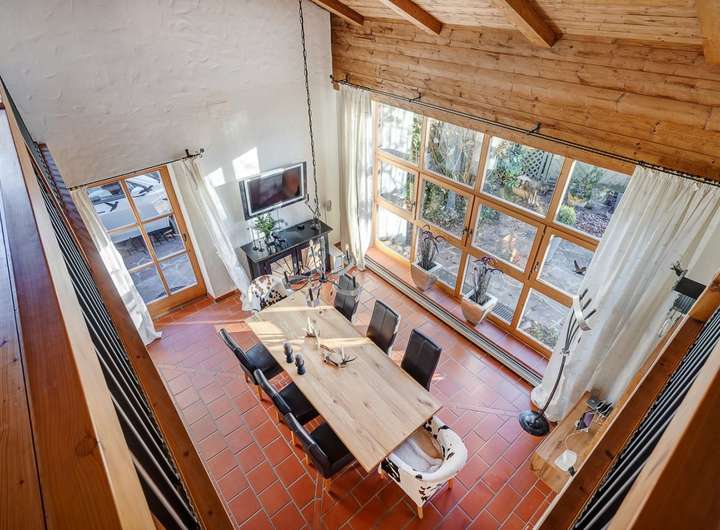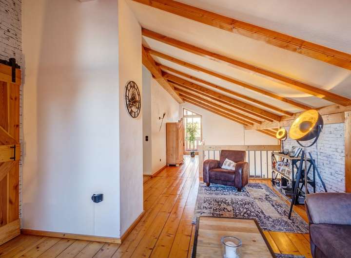 Im Obergeschoss erwartet Sie ein beeindruckend vielseitiger Grundriss. Es stehen zwei Balkone zur Verfügung, einer mit Ost und einer mit Westausrichtung, wodurch sowohl die Morgen als auch die Abendsonne optimal genutzt werden kann. Die Einliegerwohnung verfügt über eine eigene Küche, einen Wohn und Schlafbereich auf der offenen Galerie, ein separates Bad sowie einen vollständig separaten Eingang. Damit bietet sie ein hohes Maß an Privatsphäre und eignet sich ideal für Gäste, erwachsene Kinder, ein Au-pair oder eine diskrete berufliche Nutzung. Daneben befinden sich ein Kinderzimmer sowie ein weiteres Gästezimmer. Die offene Galerie unterstreicht den großzügigen architektonischen Charakter des Obergeschosses und schafft eine besondere Raumwirkung.
