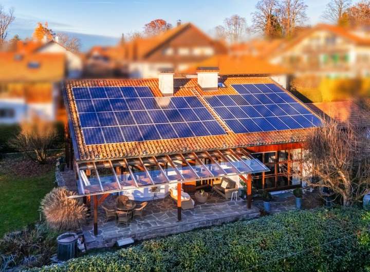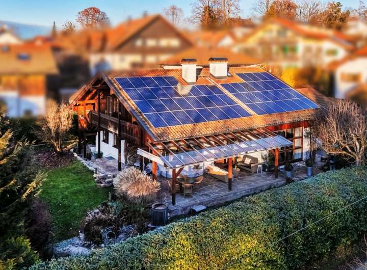 Auch technisch überzeugt das Haus auf ganzer Linie. Eine Photovoltaikanlage mit ca. 13 kW Spitzenleistung, eine moderne Wärmepumpe ca. aus dem Jahr 2024, eine Fußbodenheizung, eine Wallbox sowie eine automatisierte Steuerung für Tor, Hof und Beleuchtung sorgen für ein zeitgemäßes und zukunftsorientiertes Wohngefühl. Die Energieeffizienzklasse A mit einem Verbrauchswert von ca. 49,6 kWh pro Quadratmeter und Jahr unterstreicht den hohen energetischen Standard. Außenanlagen, Holzfassade und Balkone wurden zuletzt im Jahr 2025 erneuert und präsentieren sich ebenso gepflegt wie der gesamte Innenbereich.
