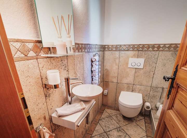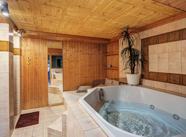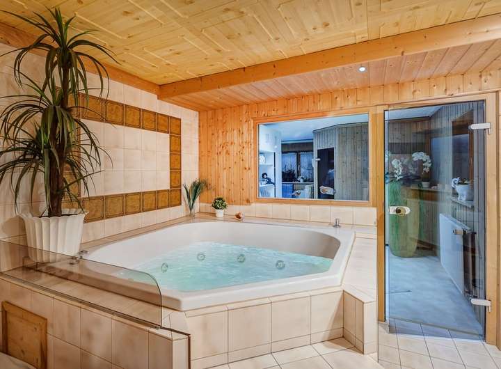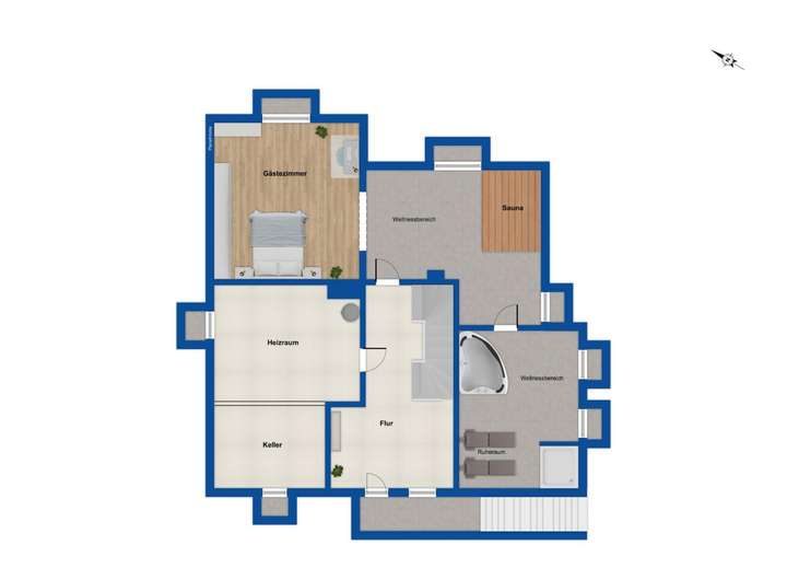 Der Wellnessbereich im Untergeschoss setzt ein klares Statement. Eine Sauna, ein Whirlpool, eine separate Ruhezone und ein zusätzliches Gästezimmer schaffen einen privaten Rückzugsort, der den Charakter eines hochwertigen Spa-Bereichs trägt. Ergänzt wird diese Ebene durch funktionale Hauswirtschafts-, Heiz- und Lagerräume.