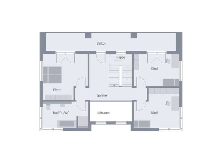 In der oberen Etage gelangen die künftigen Eigenheimbesitzer von der großen Galerie in die beiden Kinderschlafzimmer, den Elternbereich, das Badezimmer sowie auf den großen Balkon. Auch zwei weitere Zimmer ermöglichen den direkten Zugang nach draußen.
