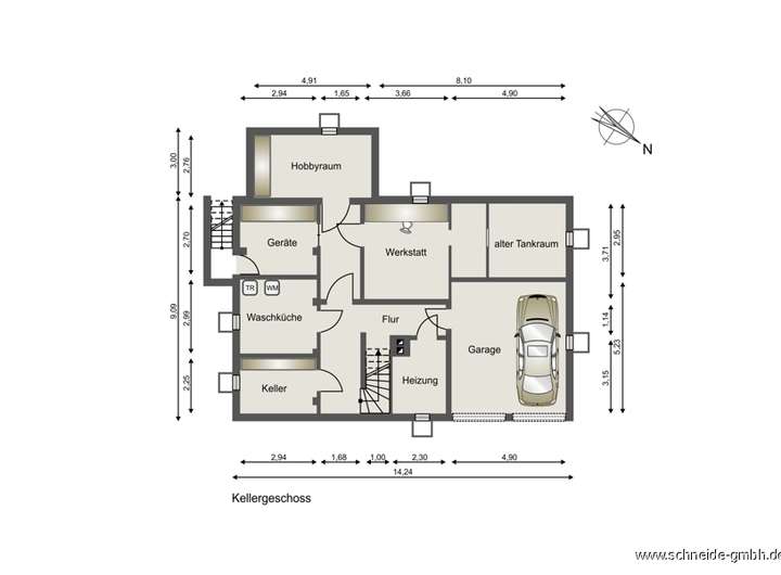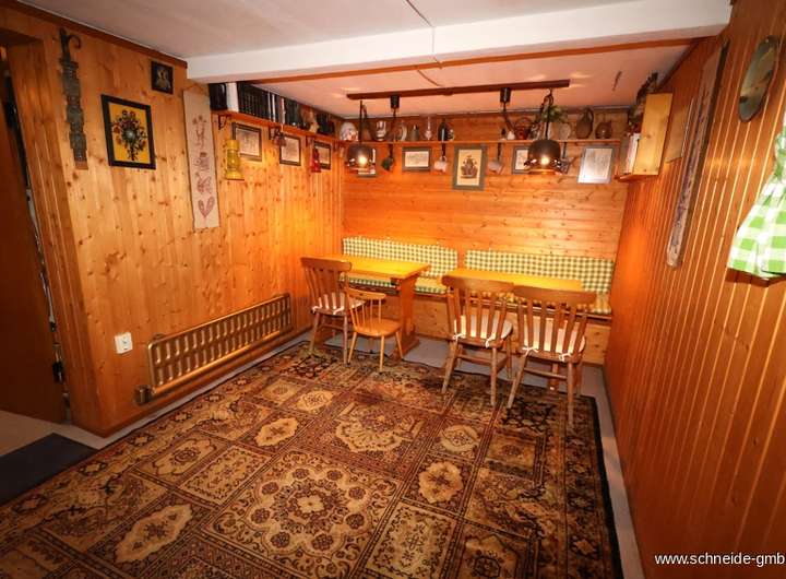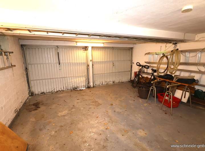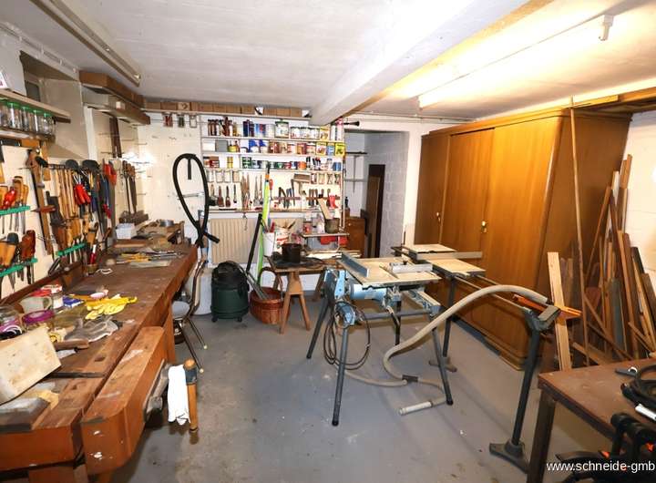Zusätzlich steht ein Vollkeller (Stehhöhe ca. 2,10 m) mit ca. 118 m² Nutzfläche zur Verfügung. Dieser beherbergt neben der Haustechnik ebenso eine Werkstatt, eine Waschküche, eine Doppelgarage sowie weitere Keller-/Abstellräume. Ein separater Außenzugang ermöglicht einen direkten Zugang zum Garten.