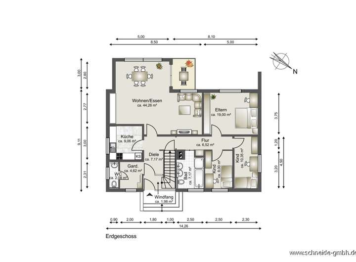 Das Erdgeschoss ist über den straßenseitigen Haupteingang zugänglich. Ausgangspunkt dieser Ebene bildet der Eingangsbereich mit anliegender Diele, von welcher aus sich die Räume verteilen. Auf rund 120 m² Wohnfläche bilden ein geräumiges Wohn-/ Esszimmer, ein Schlafzimmer, zwei Kinderzimmer, ein Bad, ein Gäste-WC und die separate Küche die Räumlichkeiten ab. Über das Wohn-/ Esszimmer erreichen Sie die großzügige, teils überdachte Terrasse, von welcher Sie den Blick in´s Grüne genießen können.