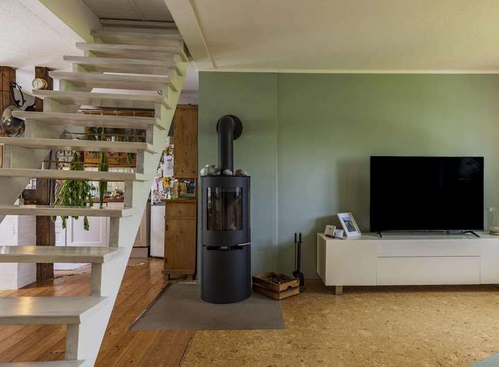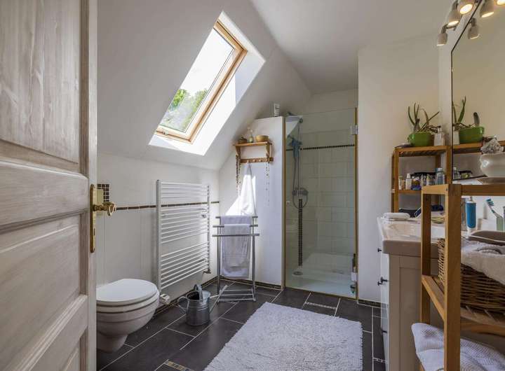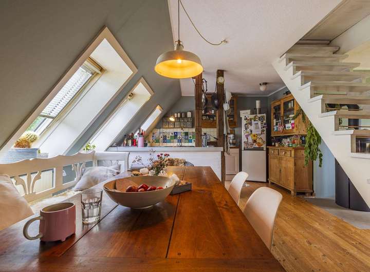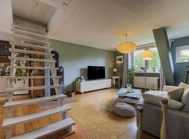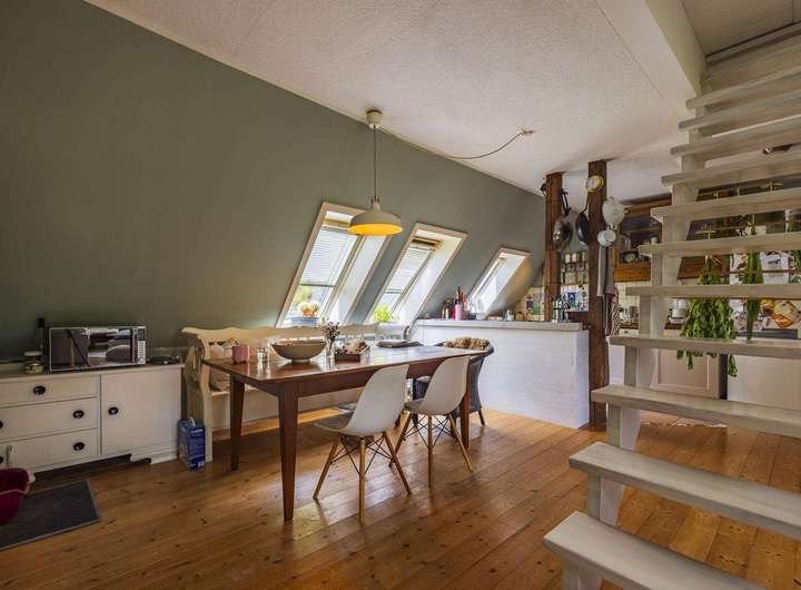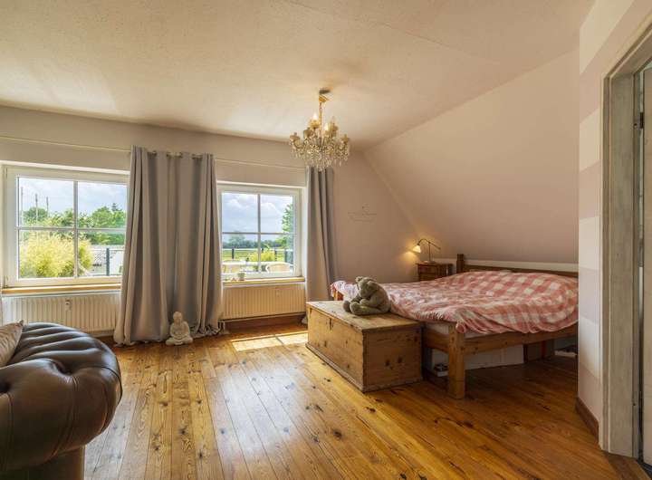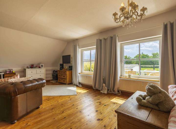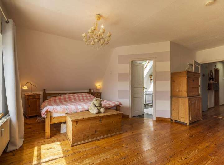 Im Dachgeschoss liegt eine weitere Wohnung mit ca. 106 m². Diese verfügt über drei Zimmer, darunter ein großes Schlafzimmer mit Balkon und wunderschönem Blick auf die Weide, zwei moderne Bäder sowie einen offen gestalteten Wohn- und Essbereich mit Kaminofen und integrierter Küche. Der Dachboden ist über eine Treppe zugänglich und dient als Stauraum.