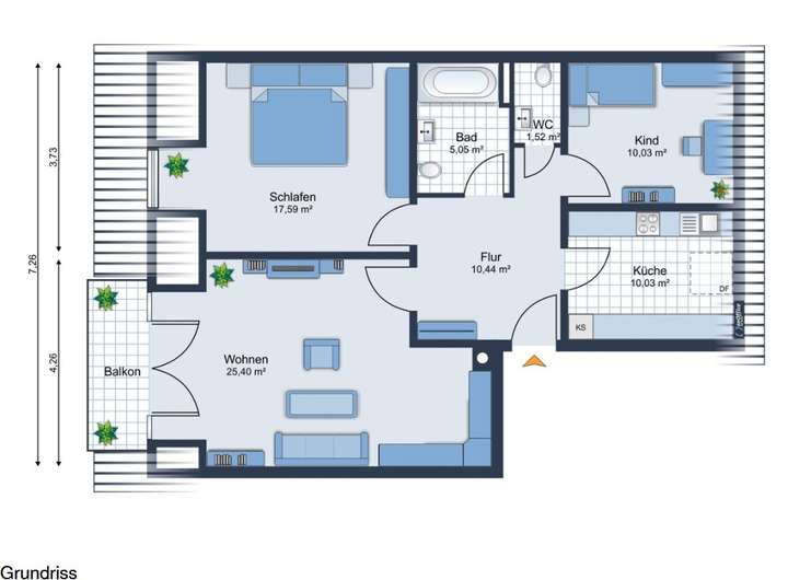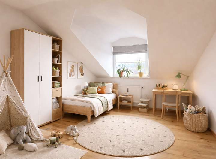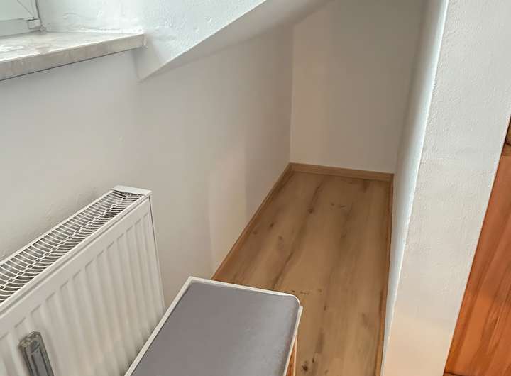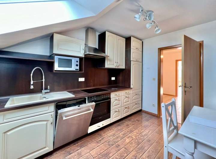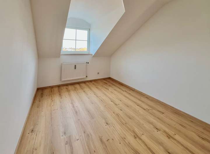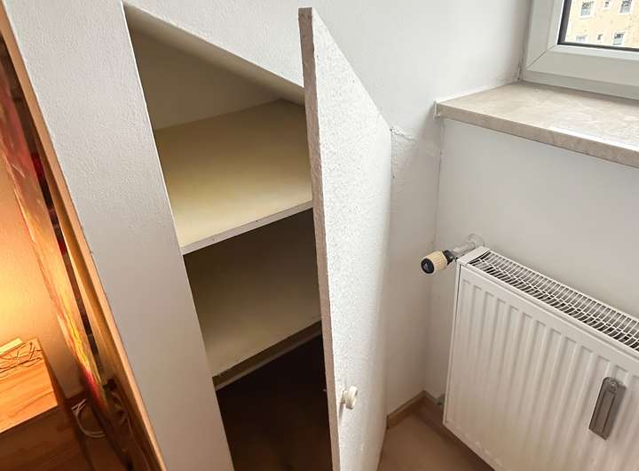 Die hohen Dachschrägen in der Wohnung unterliegen einer sinnvollen Nutzung - z. B. in der Küche als zusätzlicher Stauraum/Speisekammer oder im Schlafzimmer als zusätzlicher Kleiderschrank.