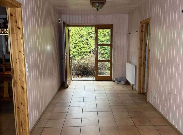 Der Grundriss ist offen und einladend: Rechts befindet sich die Küche mit angrenzendem Vorrats- und Heizungsraum, linkerhand ein Gäste-WC. Geradeaus öffnet sich das große, lichtdurchflutete Wohnzimmer, das durch Landhaustüren und helle Holzvertäfelungen eine warme, natürliche Atmosphäre schafft. Von hier aus treten Sie direkt auf die überdachte Terrasse – ein wunderbarer Ort für Familienzeit, entspannte Frühstücke im Sommer oder gemütliche Abende mit Blick ins Grüne.