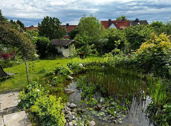 Das etwa 500 m² große Grundstück begeistert mit einer hochwertig angelegten Gartenanlage inklusive Teich.